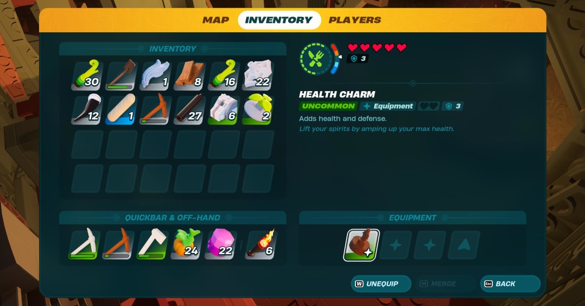 However, as you upgrade your Crafting Bench in LEGO Fortnite, you will unlock better versions of the charm that give you more hearts and defense. Plus, there are extra items like the Cold-Headed Charm that give you extra hearts as well as bonuses like heat resistance.