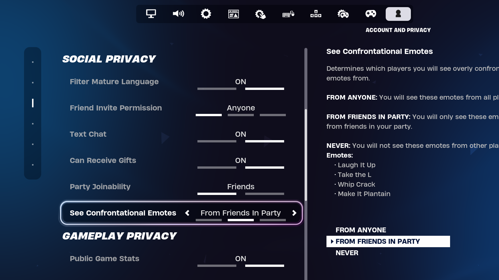 Epic Games will allow Fortnite players to toggle the visibility of “confrontational” emotes in the coming update for the game. Players will be able to hide certain emotes entirely or, alternatively, only show them when used by friends. Naturally, the default option of seeing them used by all players is still available as well.